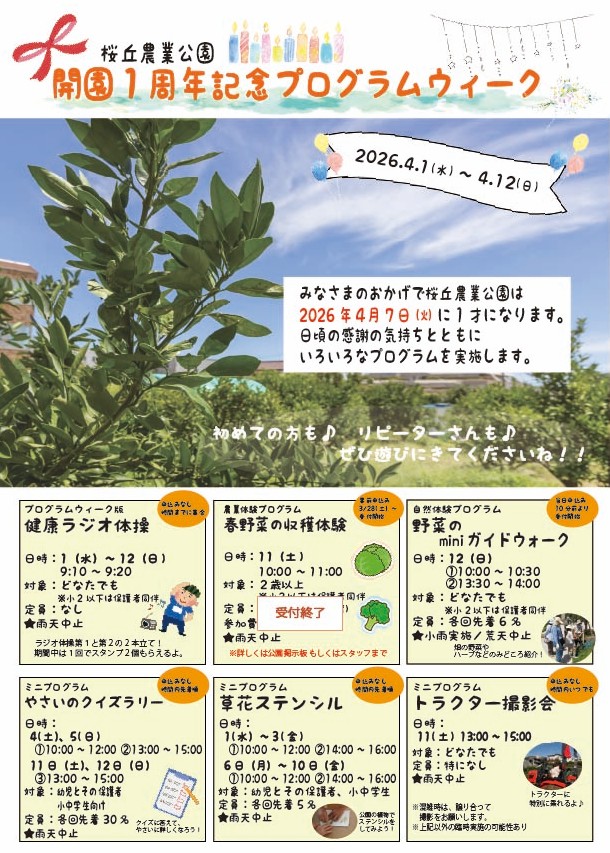 みなさまのおかげで桜丘農業公園は2026年4月7日(火)に1才を迎えます。